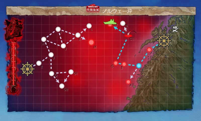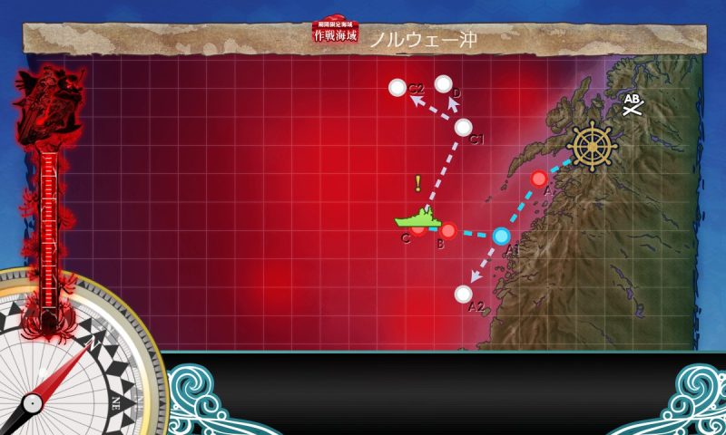 C2:A(通常、警戒陣)→A1(能動分岐)→B(対潜、警戒陣)→C(通常、警戒陣)→C1(空襲、輪形陣)→C2(通常、ギミック、単縦陣)