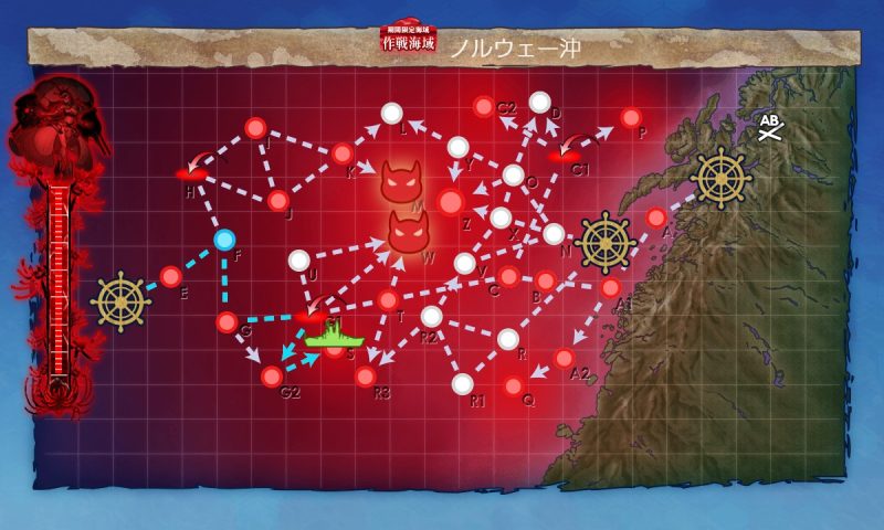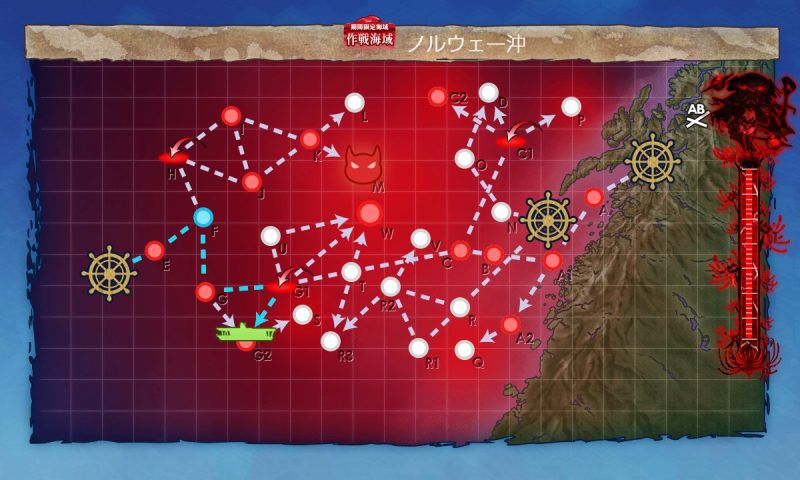 E(対潜、第一)→F(能動分岐)→G(通常、第四)→G1(空襲、第三)→G2(通常、ギミック、第二)