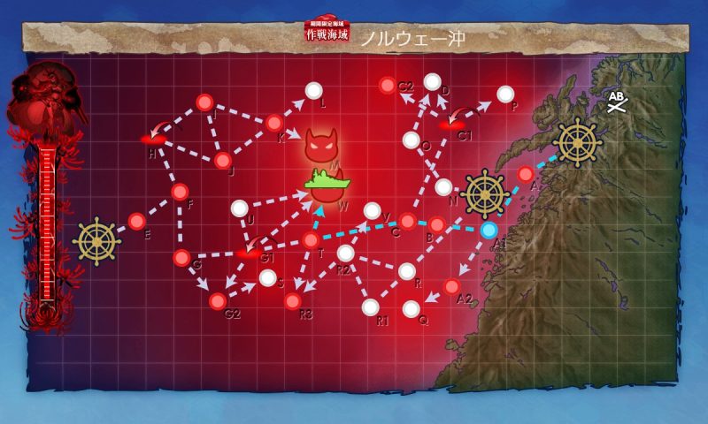 A(通常、警戒陣)→A1(能動分岐)→B(対潜、警戒陣)→C(通常、警戒陣)→T(通常、警戒陣)→W(ボス、単縦陣)