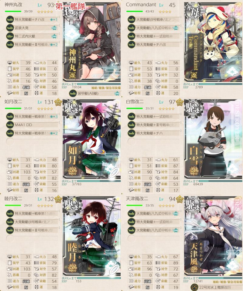 一度神州丸に司令部を搭載していきましたが、コマンダンテストと涼月が退避したら輸送マスからB3マスにそれてしまったため、司令部無しとしました。