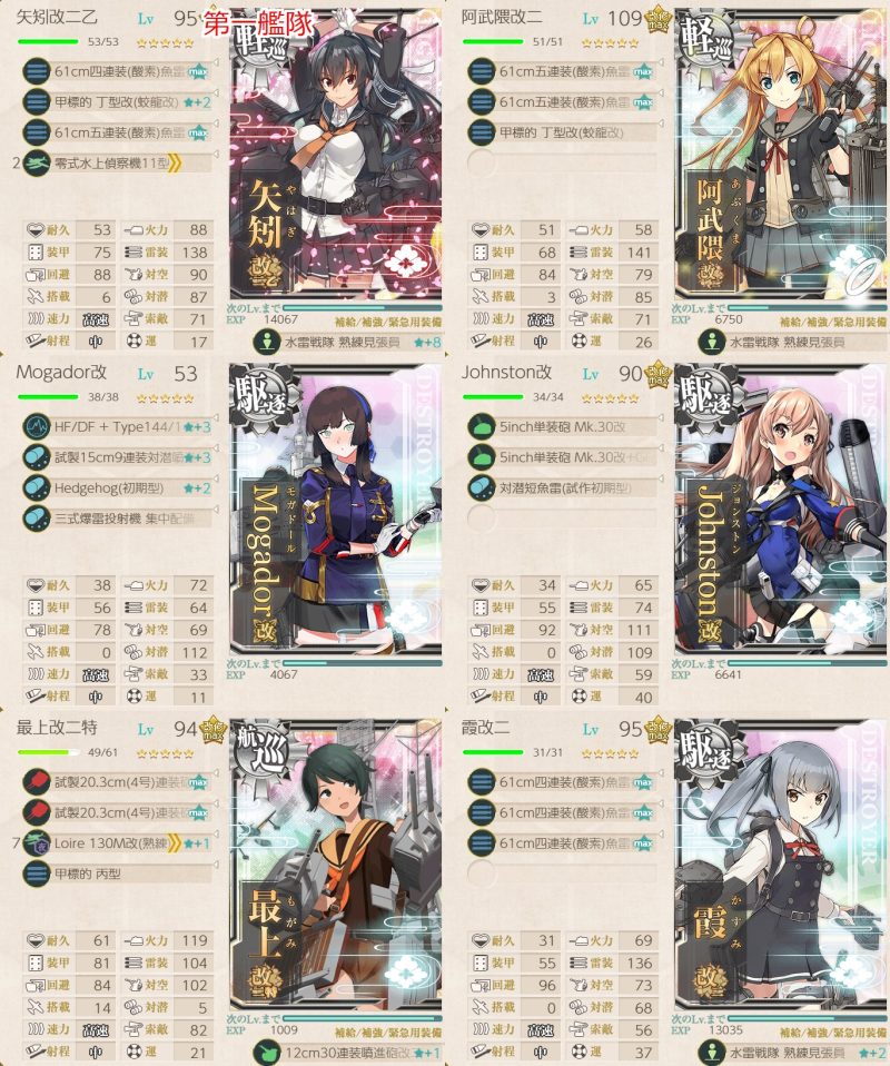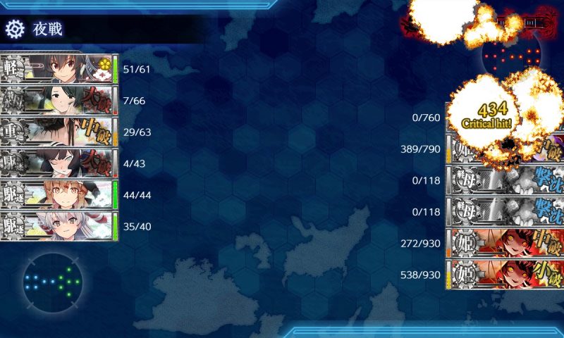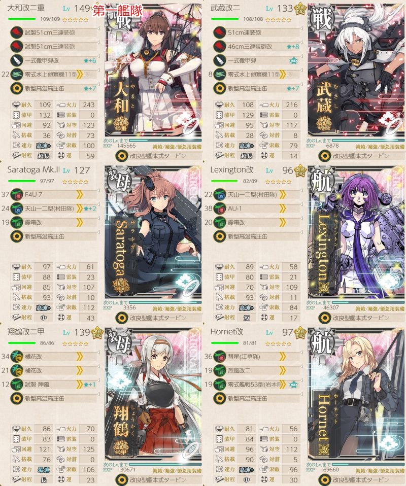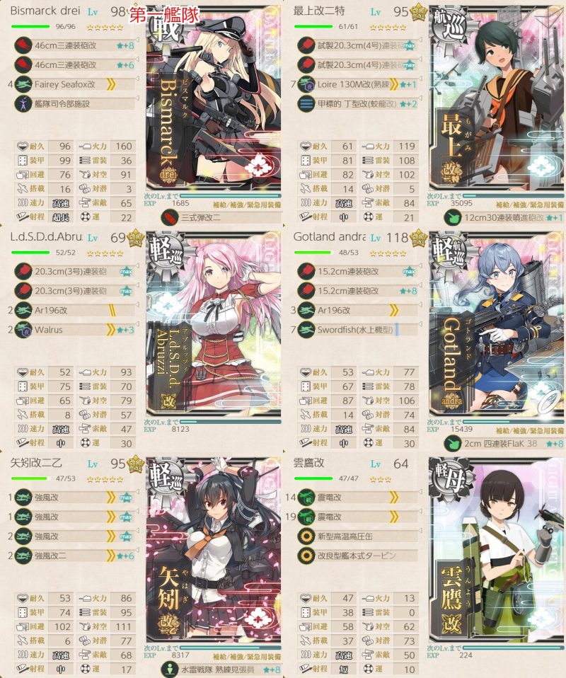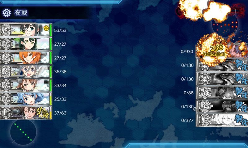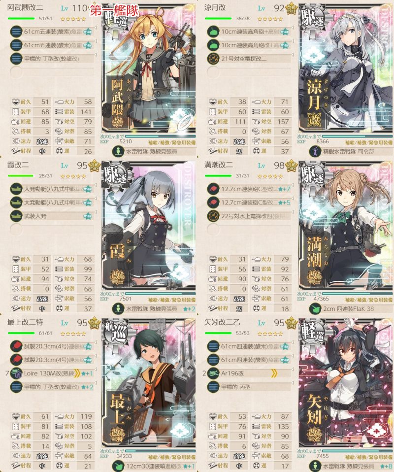 基地+決戦支援でボス以外全滅、閉幕雷撃でボス中破、昼第一艦隊との戦いでボスは中破で攻撃してこず、割合で削り、夜戦で大淀の連撃で撃沈、という完璧な流れでした。