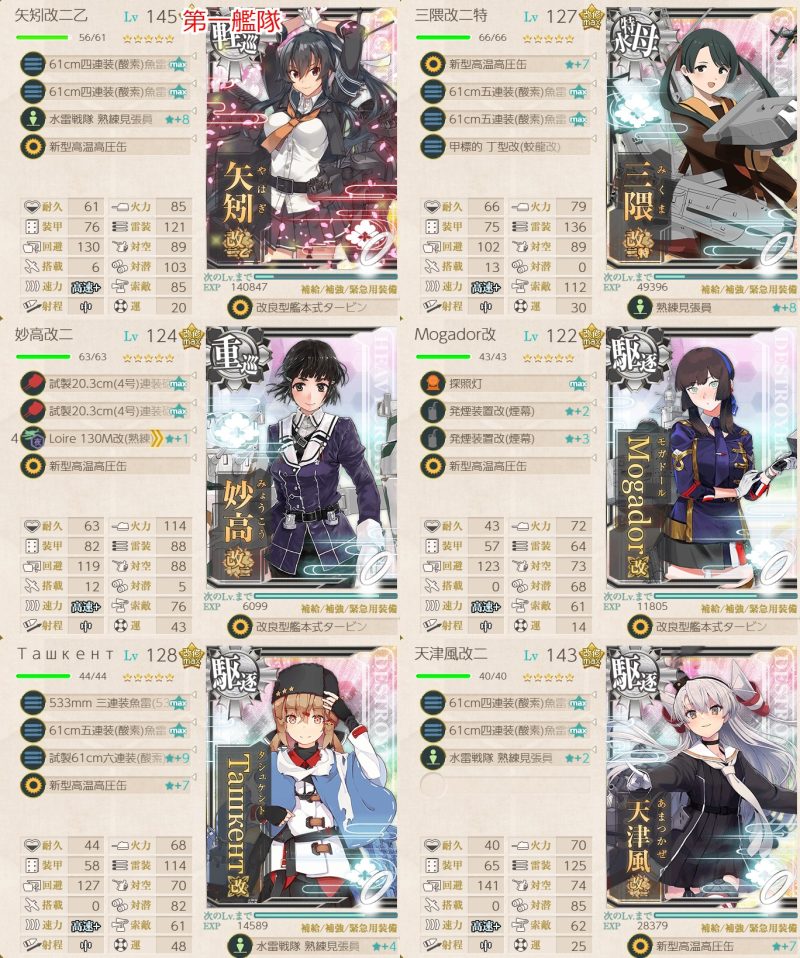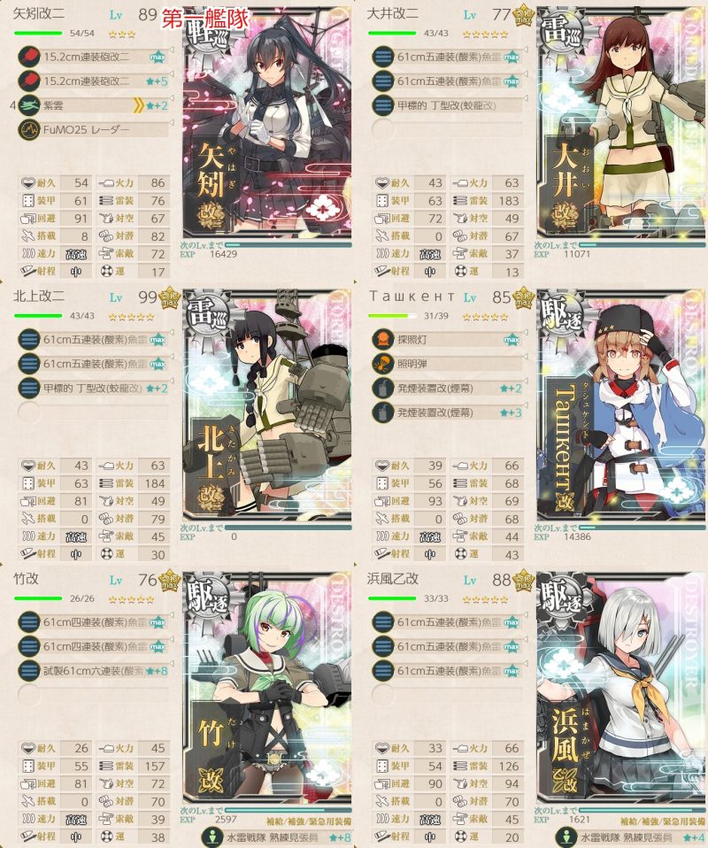 タシュケント以外はみな夜戦カットイン率が5~6割しかないので出撃回数がかさみました。