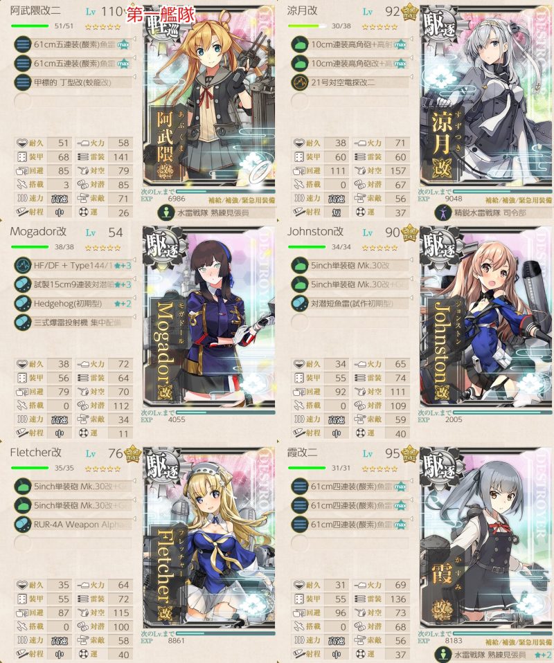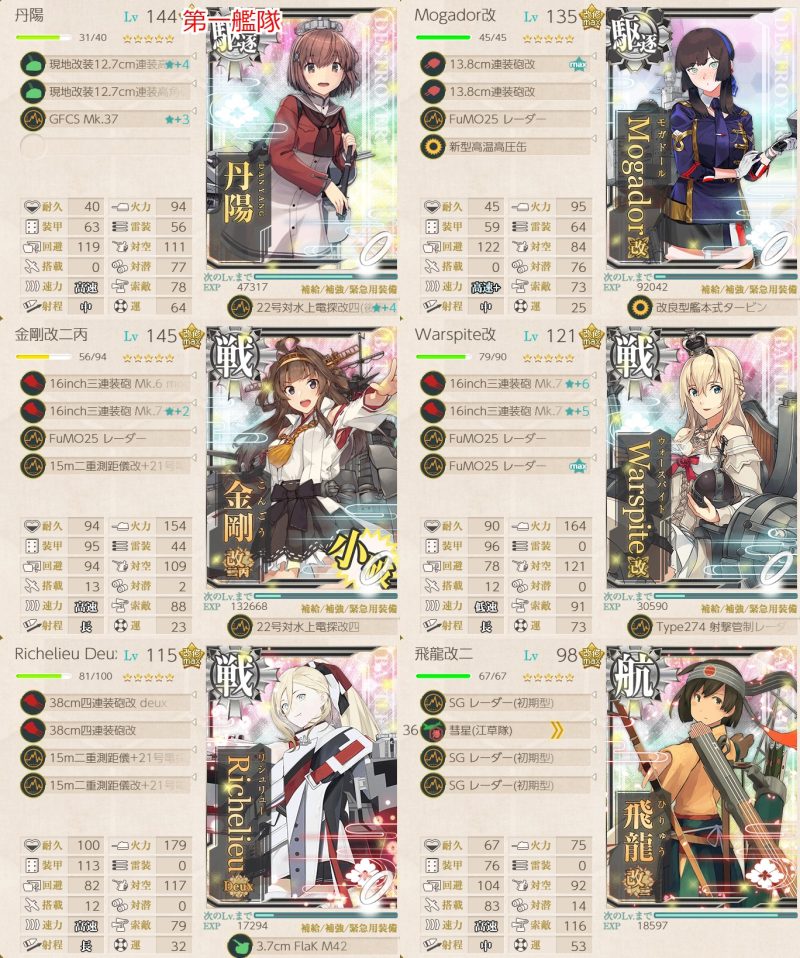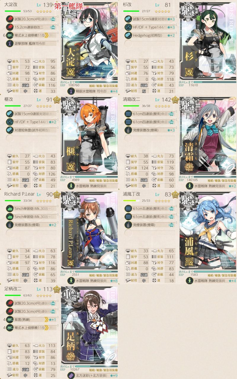 最終編成も含め、ボスは大淀や足柄の連撃で落とせるので、リチャードの煙幕をGCFS電探にして、浦風を煙幕キャリアにしてもよかったかもしれません。