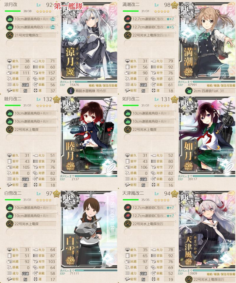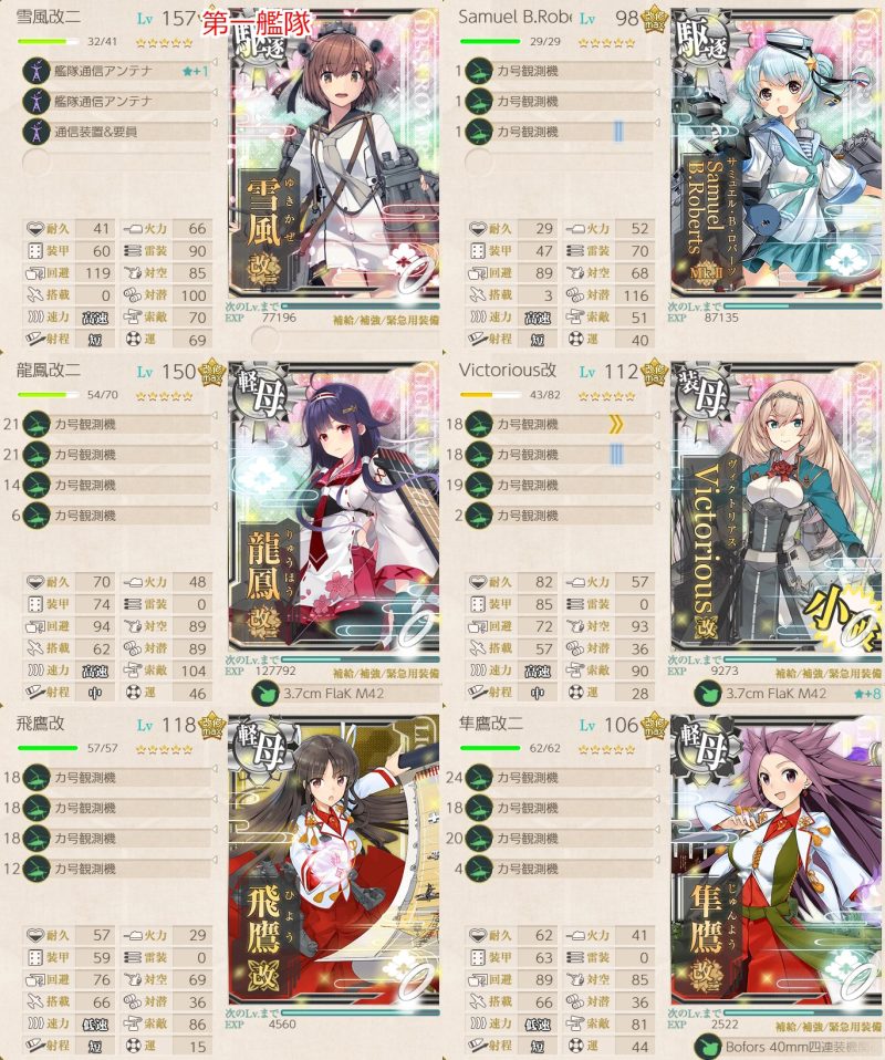 夜偵は装備し忘れ。昼にボスに100程度のダメージを与えていれば、夜戦では北上、竹、浜風のカットインが一撃でボスを落としてくれるため、特に問題はありませんでした。