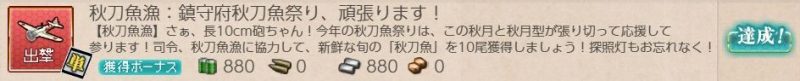 [期間限定任務][単発任務]秋刀魚漁:鎮守府秋刀魚祭り、頑張ります!【鎮守府秋刀魚祭り】秋刀魚塩焼き演習!