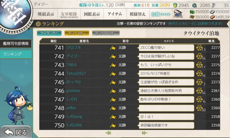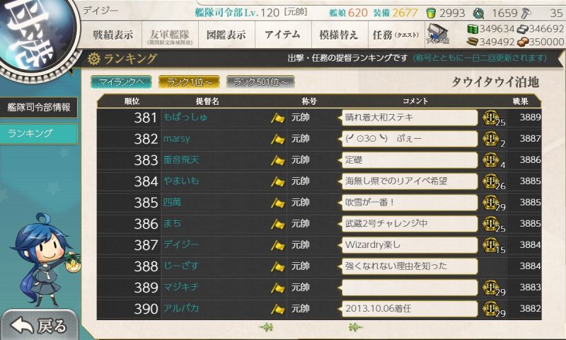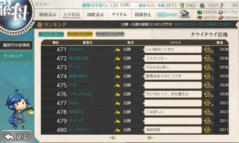 この後クォータリーすべてクリアして+2050、7-1を周回、給マークが点滅したら4-4、という感じで戦果を稼いで2023/12/30に確認した時点で170位程度だったはず(戦果値は覚えていません)