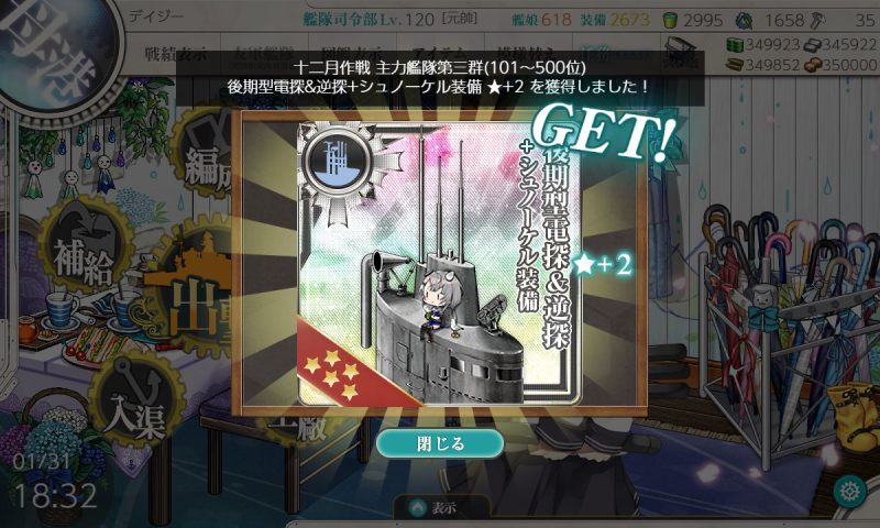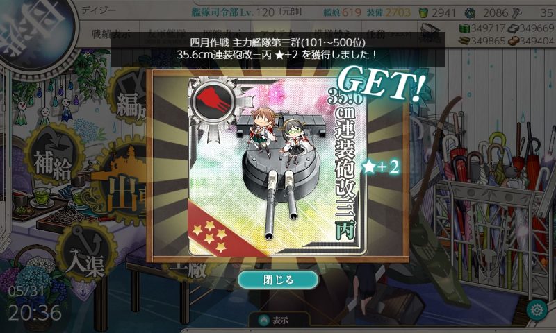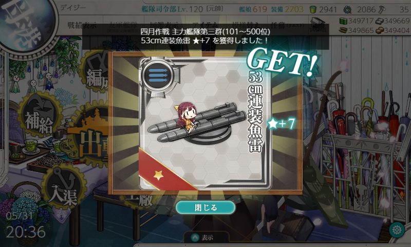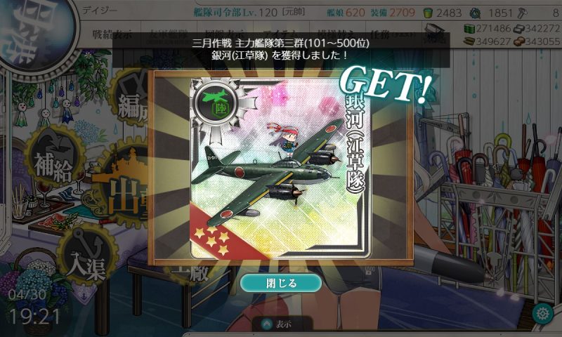 戦果は意識してはあんまり稼いでおらず、イベント海域の周回と、遠征用のキラ付けを可能な限り7-1で実施するようにしたくらい。