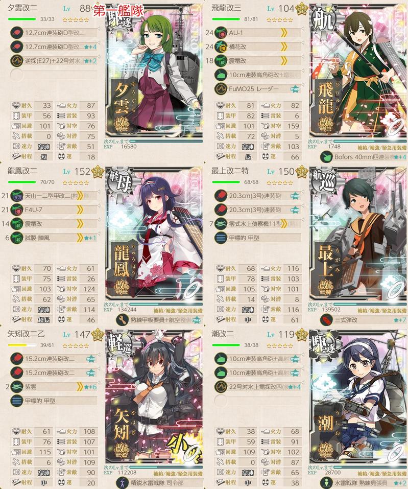 「Minneapolis」「Samuel B.Roberts」「夕雲」「潮」を旗艦と随伴艦に含む+4隻自由な編成で、2-4、2-5、7-2-2ボスで2回ずつS勝利を取得する。
