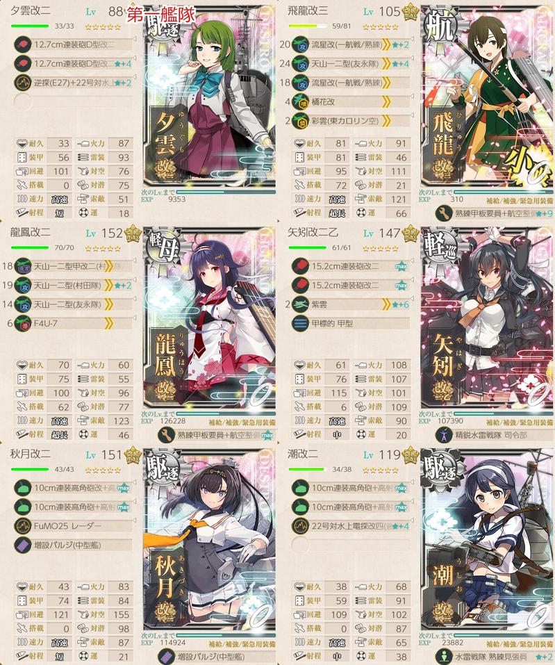 通常は艦載機搭載した方が良いと思いますが、せっかく実装されたばかりの艦なので飛龍改三を連れて対空カットインをしてもらいましたが、7-2-2ボスのヲ級を枯らしてくれたりしました。