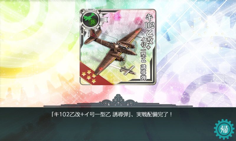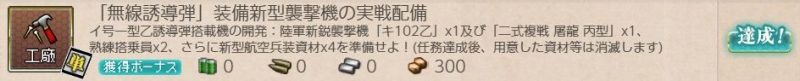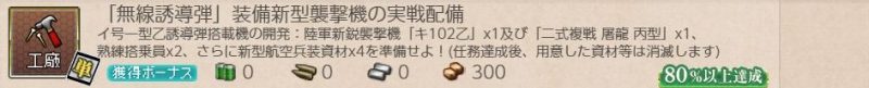 [単発任務]「無線誘導弾」装備新型襲撃機の実戦配備 単発任務 2026.02.21 この記事は約1分で読めます。 目次 概要前提任務後続任務任務条件報酬 概要 [単発任務]「無線誘導弾」装備新型襲撃機の実戦配備の記録です。 前提任務 [単発任務]「一式陸攻」性能向上型の調達[単発任務]基地航空隊戦力の拡充 後続任務 なし 任務条件 以下を準備して任務を受託する。(必要なアイテムがそろった状態で任務を受けていないと、画像のように80%達成が付き、受託時点で達成となります) キ102乙×1 二式複戦 屠龍 丙型×1 熟練搭乗員×2 新型航空兵装資材×4 報酬 ボーキサイト300、キ102乙改+イ号一型乙 誘導弾×1を取得。