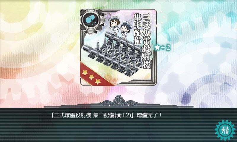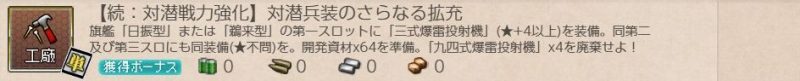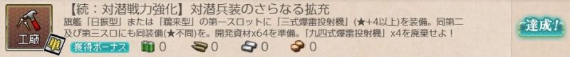 [単発任務]【続:対潜戦力強化】対潜兵装のさらなる拡充 単発任務 2026.02.21 この記事は約1分で読めます。 目次 概要前提任務後続任務任務条件報酬 概要 [単発任務]【続:対潜戦力強化】対潜兵装のさらなる拡充の記録です。 前提任務 [単発任務]【対潜戦力強化】海防艦対潜兵装の強化 後続任務 [単発任務]【新型対潜兵装開発】対潜噴進爆雷砲の開発 任務条件 第一艦隊の旗艦に「日振型」または「鵜来型」を配備、第一装備スロットに「三式爆雷投射機★4以上」を装備、第二、第三装備スロットに「三式爆雷投射機(★不問)」を装備して、 開発資材×64 を準備して 九四式爆雷投射機×4 を廃棄する。 報酬 三式爆雷投射機集中配備★2×1を取得。
