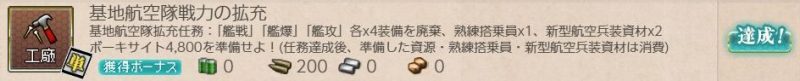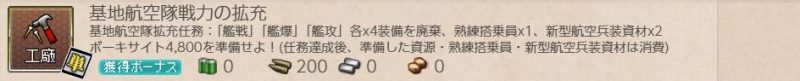 [単発任務]基地航空隊戦力の拡充 単発任務 2026.02.21 この記事は約1分で読めます。 目次 概要前提任務後続任務任務条件報酬 概要 [単発任務]基地航空隊戦力の拡充の記録です。 前提任務 「航空基地設営」事前準備[単発任務]戦闘機隊戦力の拡充 後続任務 「無線誘導弾」装備新型襲撃機の実戦配備 任務条件 熟練搭乗員×1 新型航空兵装資材×2 ボーキサイト4800 を準備して 艦戦×4 艦爆×4 艦攻×4 を廃棄する。 報酬 弾薬×200、以下いずれかを選択 雷電×1 試製東海×1 紫電一一型×2 試製東海×1を選びました。