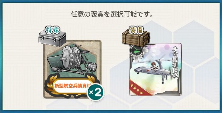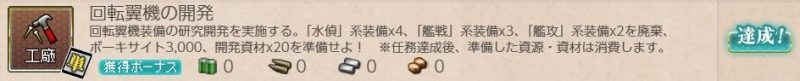 [単発任務]回転翼機の開発 単発任務 2026.02.21 この記事は約1分で読めます。 目次 概要前提任務後続任務任務条件報酬 概要 [単発任務]回転翼機の開発の記録です。 前提任務 [デイリー任務]新装備「開発」指令[単発任務]「海防艦」整備計画 後続任務 [単発任務]新型航空艤装の研究 任務条件 開発資材×20 ボーキサイト×3000 を準備して 水偵×4 艦戦×3 艦攻×2 を廃棄する。 報酬 以下いずれかを選択 新型航空兵装資材×2 オ号観測機改×1 オ号観測機改×1を選びました。
