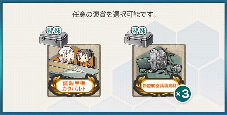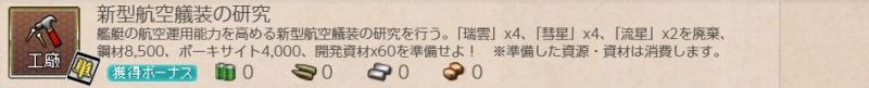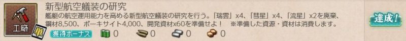 [単発任務]新型航空艤装の研究 単発任務 2026.02.21 この記事は約1分で読めます。 目次 概要前提任務後続任務任務条件報酬 概要 [単発任務]新型航空艤装の研究の記録です。 前提任務 [デイリー任務]「演習」で練度向上![単発任務]回転翼機の開発 後続任務 最精鋭「第四航空戦隊」、出撃せよ! 任務条件 鋼材×8500 ボーキサイト×4000 開発資材×60 を準備して 瑞雲×4 彗星×4 流星×2 を廃棄する。 報酬 以下いずれかを選択 試製甲板カタパルト×1 新型航空兵装資材×3 試製甲板カタパルト×1を選びました。