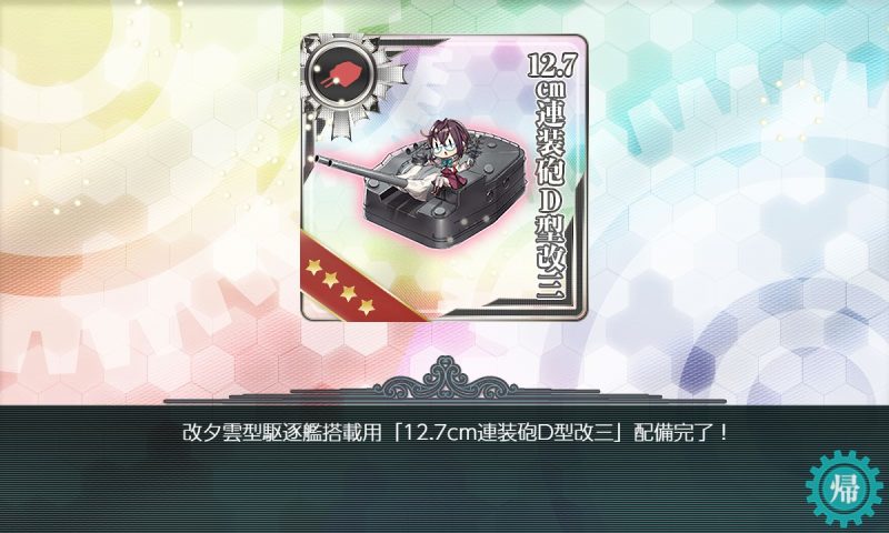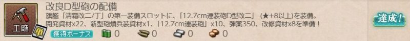[単発任務]改良D型砲の配備 単発任務 2026.02.17 この記事は約1分で読めます。 目次 概要前提任務後続任務任務条件報酬 概要 [単発任務][工廠任務]改良D型砲の配備の記録です。 前提任務 [単発任務][工廠任務]艦載用「煙幕発生装置」の改良[単発任務][工廠任務]砲熕兵装の整備 他にもあるかも。 後続任務 なし 任務条件 開発資材×22 新型砲熕兵装資材×1 12.7cm連装砲×10 弾薬×350 改修資材×8 を準備して、 第一艦隊旗艦に「清霜改二/丁」を配備。第一装備スロットに「12.7cm連装砲D型改二★8以上」を装備する。 報酬 12.7cm連装砲D型改三×1を取得。