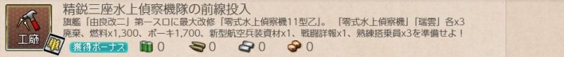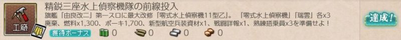 [単発任務]精鋭三座水上偵察機隊の前線投入 単発任務 2025.11.17 この記事は約1分で読めます。 目次 概要前提任務後続任務任務条件報酬 概要 [単発任務]精鋭三座水上偵察機隊の前線投入の記録です。 前提任務 旗艦「由良」、抜錨!精鋭「水戦」隊の新編成 後続任務 【工廠任務】新夜偵の実戦配備 任務条件 第一艦隊旗艦「由良改二」の第一装備スロットに改修MAXの「九八式水上偵察機11型乙」を装備し、 燃料×1300 ボーキサイト1700 新型航空兵装資材×1 戦闘詳報×1 熟練搭乗員×3 を準備して、 「零式水上偵察機」×3 「瑞雲」×3 を廃棄する。 報酬 零式水上偵察機11型乙(熟練)×1