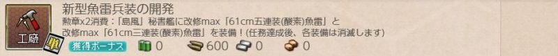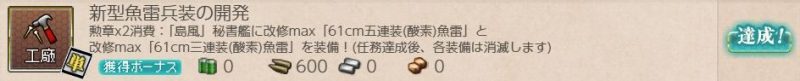 [単発任務]新型魚雷兵装の開発 単発任務 2026.02.17 この記事は約1分で読めます。 目次 概要前提任務後続任務任務条件報酬 概要 [単発任務]新型魚雷兵装の開発の記録です。 前提任務 [ウィークリー任務]対空機銃量産[単発任務]鎮守府近海航路の安全確保を強化せよ! 後続任務 なし 任務条件 勲章×2を用意して、第一艦隊の旗艦「島風」に「61cm五連装(酸素)魚雷★10」と「61cm三連装(酸素)魚雷」を装備する。 報酬 弾薬600、改修資材×6、試製61cm六連装(酸素)魚雷×1を取得。