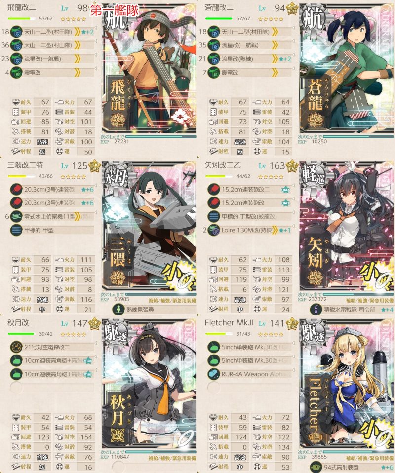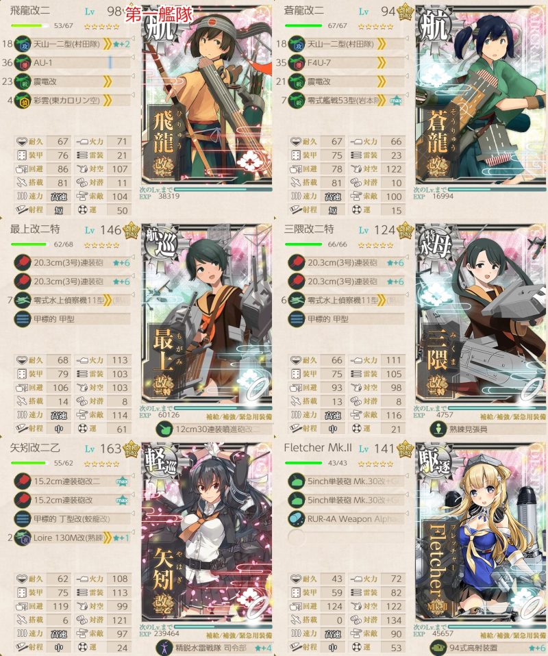 「飛龍」「蒼龍」を旗艦、二番艦に、他自由な編成で2-2、2-3、2-4、5-2、5-4ボスで1回ずつS勝利を取得する。