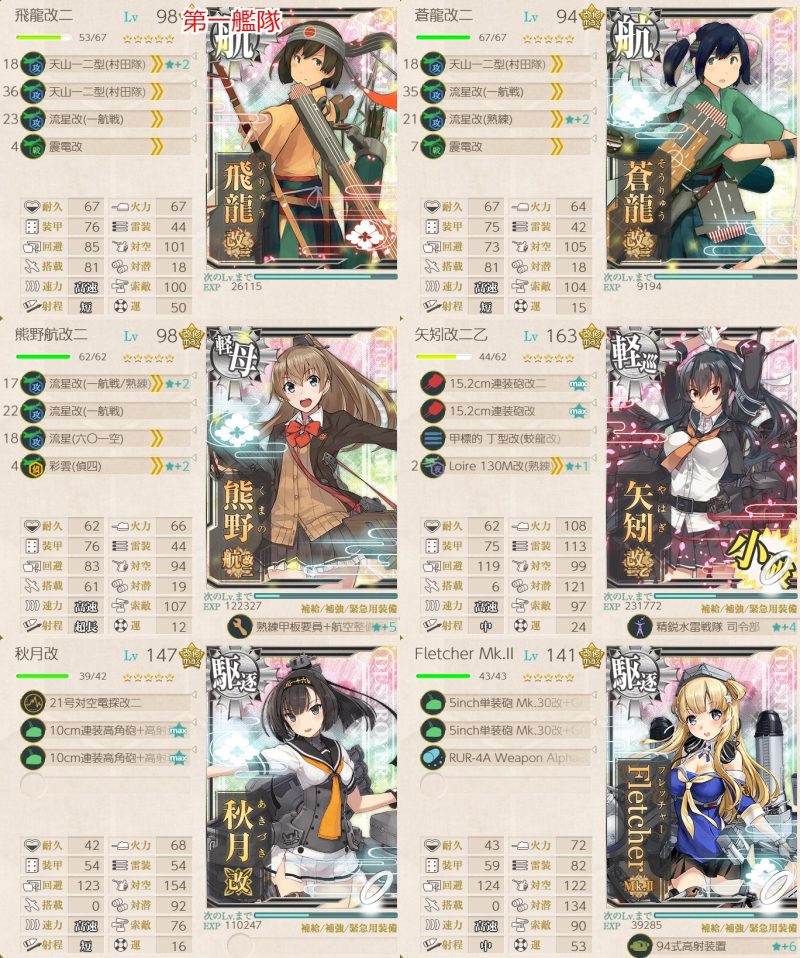 初月をイベント掘りに使用中のため、対空カットインしながら先制対潜できる艦としてフレッチャーを選択(増設してある秋月でも可能ですがフレッチャーの方が対潜を高くできるため)