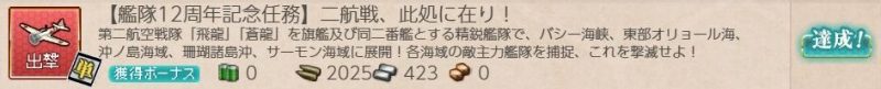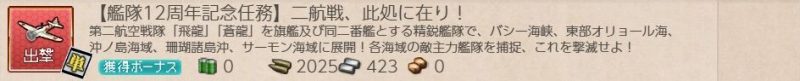 [期間限定任務][単発任務]【艦隊12周年記念任務】二航戦、此処に在り!の記録です。
