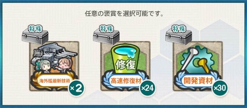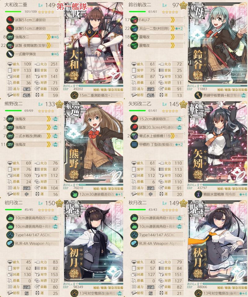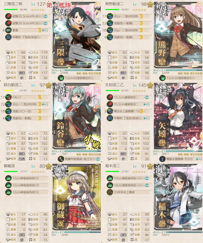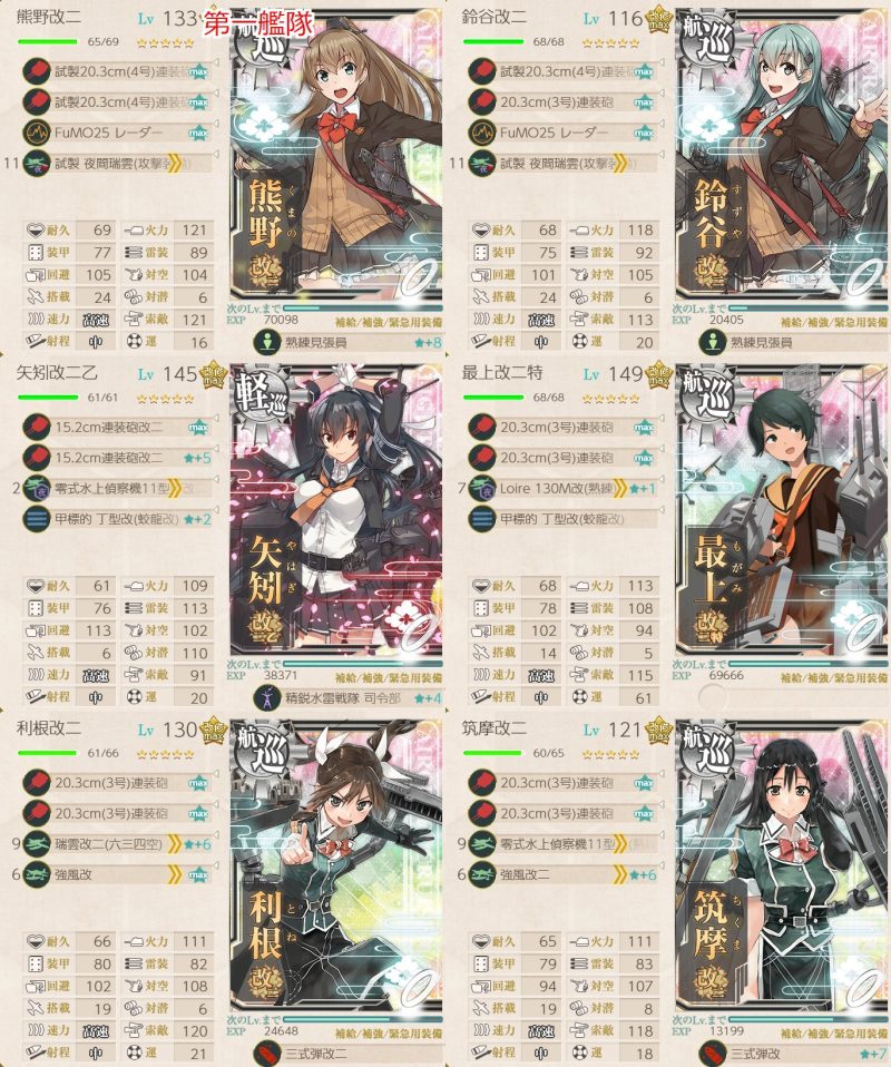 「衣笠」「鈴谷」「熊野」「大淀」「球磨」「鹿島」「矢矧改二/乙」「酒匂」「sheffield」「Atlanta」から3隻以上を含む編成で2-2、5-3、5-5ボスで2回ずつS勝利を取得する。