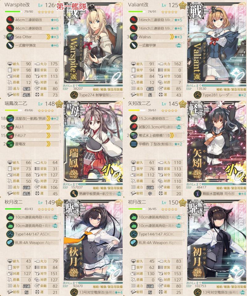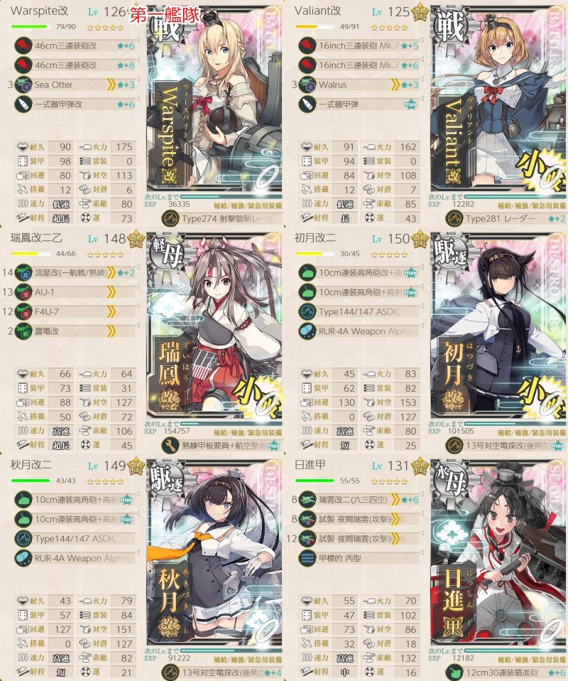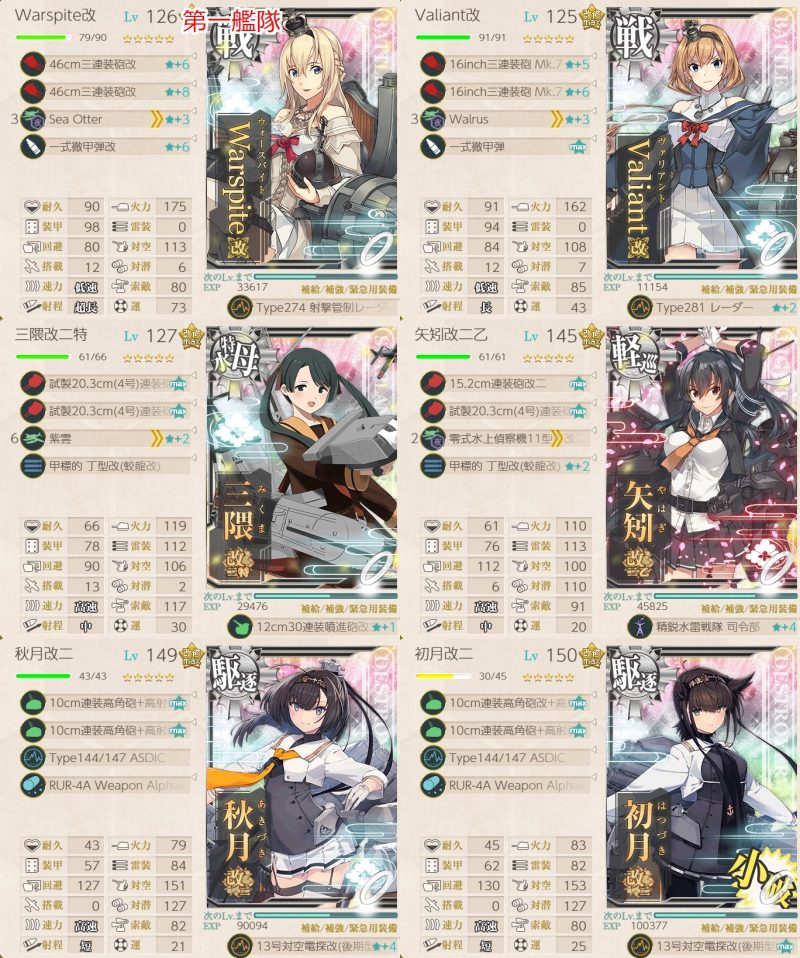 旗艦、随伴艦に「Warspite」「Valiant」「Nevada」「Littorio」「Italia」「Jean Bart」から1隻ずつ含む編成で2-3、2-4、5-1ボスで2回ずつS勝利を取得する。