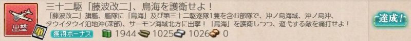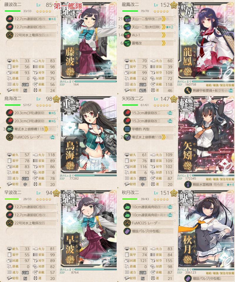「藤波改二」旗艦+「鳥海」+三十二駆逐隊(「玉波」「涼波」「早波」「浜波」)から1隻+3隻自由な編成で2-4、2-5、7-2-2、5-5ボスで1回ずつS勝利を取得する。