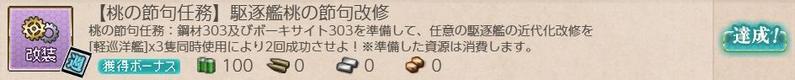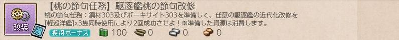 [期間限定任務][ウィークリー任務]【桃の節句任務】駆逐艦桃の節句改修 ウィークリー任務 2026.03.032026.03.23 この記事は約1分で読めます。 目次 概要前提任務後続任務任務条件報酬 概要 [期間限定任務][ウィークリー任務]【桃の節句任務】駆逐艦桃の節句改修の記録です。 前提任務 [期間限定任務][単発任務]【桃の節句】鎮守府近海 春の安全確保2026 他にもあるかも? 後続任務 [期間限定任務][ウィークリー任務]【桃の節句任務】海防艦桃の節句改修 任務条件 鋼材303 ボーキサイト303 を準備して、「軽巡洋艦」3隻を同時に使用した駆逐艦の近代化改修を2回成功させる。 報酬 燃料100、開発資材×2、菱餅×1を取得。