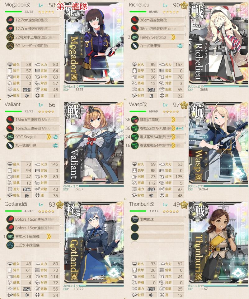 「Thonburi」「Helena」「Mogador」「Gotland」「Perth」「Commandant Teste」「曙」「朧」「野崎」から1隻を旗艦、旗艦以外に2隻+3隻自由な編成で、同日中に演習で5回S勝利を取得する。