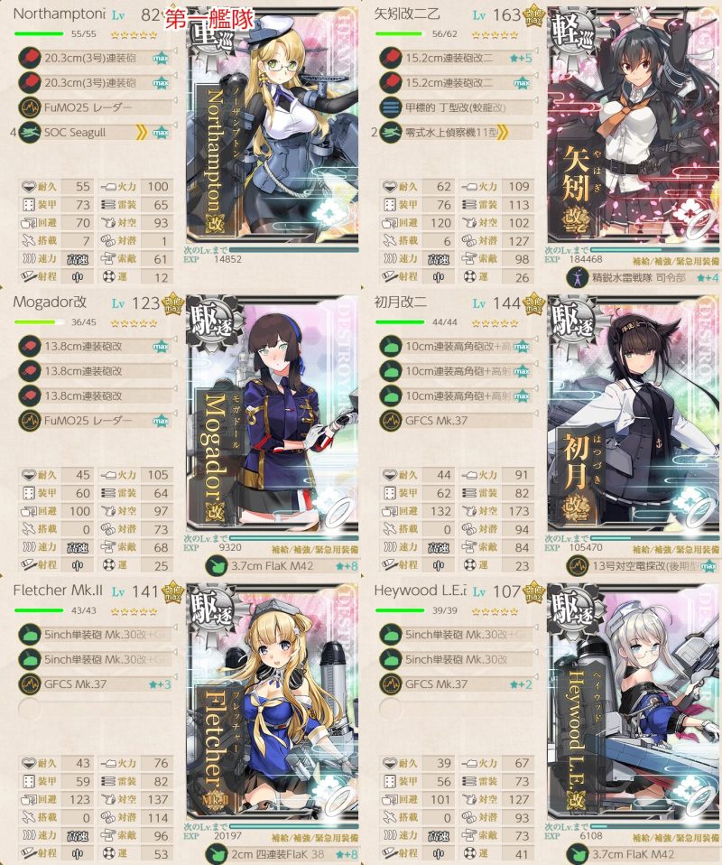 Fletcher級駆逐艦(Fletcher、Johnston、Heywood L.E.、Richard P.Leary)2隻、Northampton、Houston、Minneapolis、Tuscaloosaから1隻、他3隻自由な編成で1-3、1-4、2-4ボスで2回ずつS勝利を取得する。