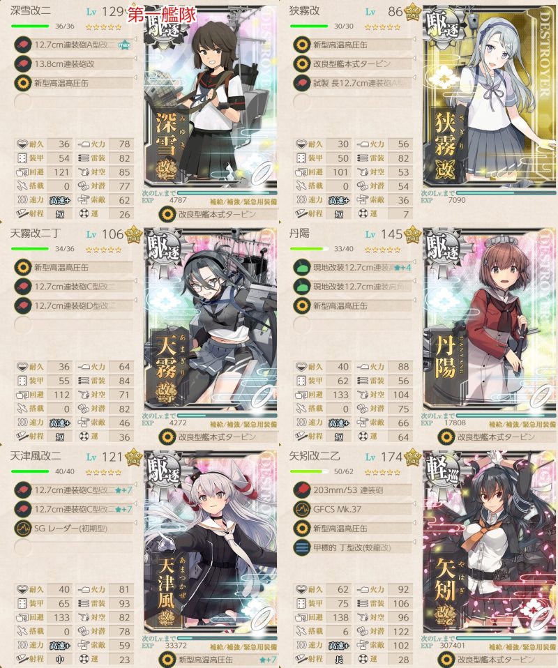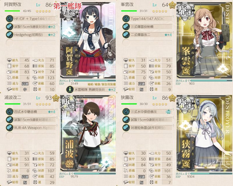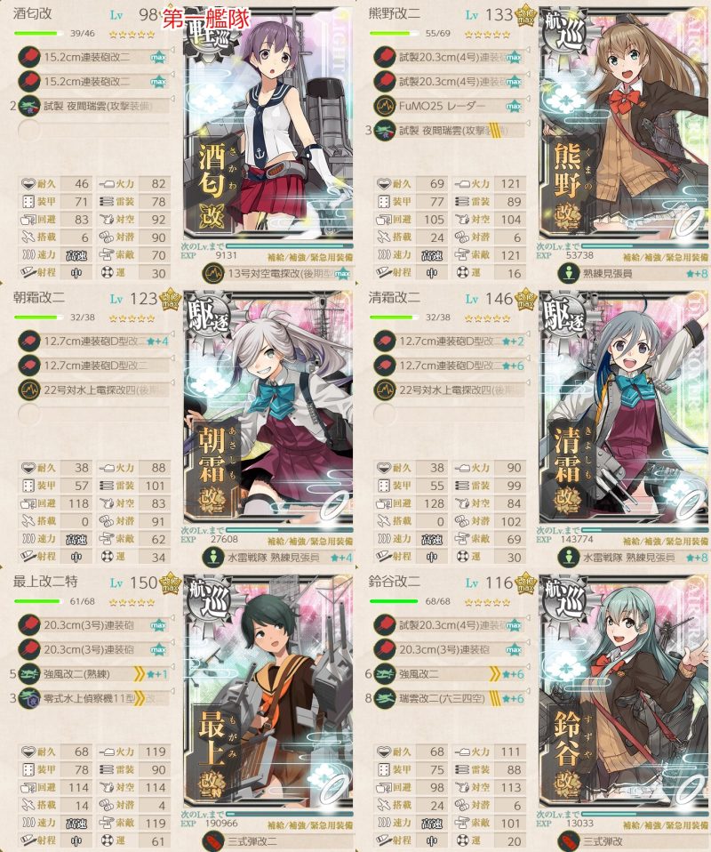 旗艦及び2隻を「阿賀野」「酒匂」「瑞穂」「如月」「深雪」「浦波」「天龍」「狭霧」「峰雲」「清霜」「朝霜」何れかとし、3隻自由な編成で1-5、3-2、5-3、6-2ボスで2回ずつS勝利を取得する。