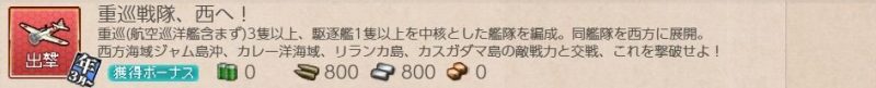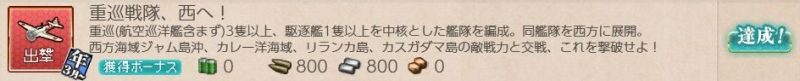 重巡3隻(航巡不可)、駆逐艦1隻+2隻自由な編成で、4-1、4-2、4-3、4-4ボスで1回ずつA勝利以上を取得する。